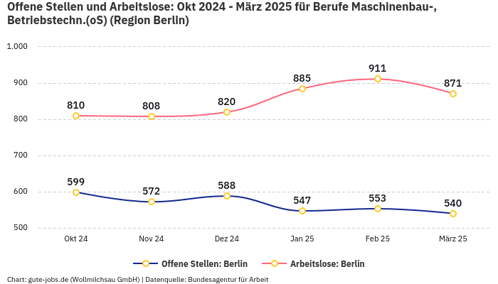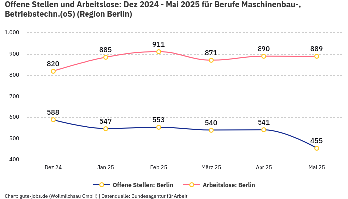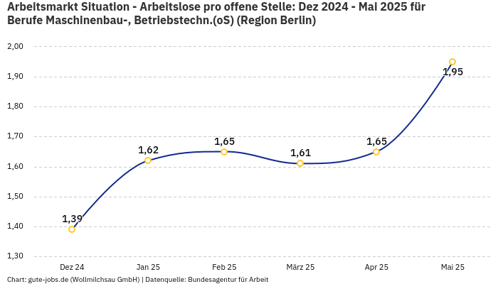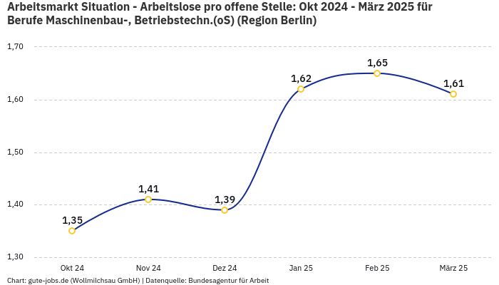 Wir verraten Dir, wie Deine Chancen auf eine erfolgreiche Bewerbung als Ingenieur Maschinenbau in Potsdam sind. Laut offiziellen Zahlen stehen in der Berufsgruppe “Berufe Maschinenbau-, Betriebstechn.(oS)” im Monat 836 registrierten Arbeitslosen bei der Bundesagentur für Arbeit 549 offene Jobs gegenüber. So kamen in der Arbeitsmarktregion Berlin, in der Du einen neuen Job suchst, im November 2025 1,52 Arbeitslose auf eine offene Stelle.