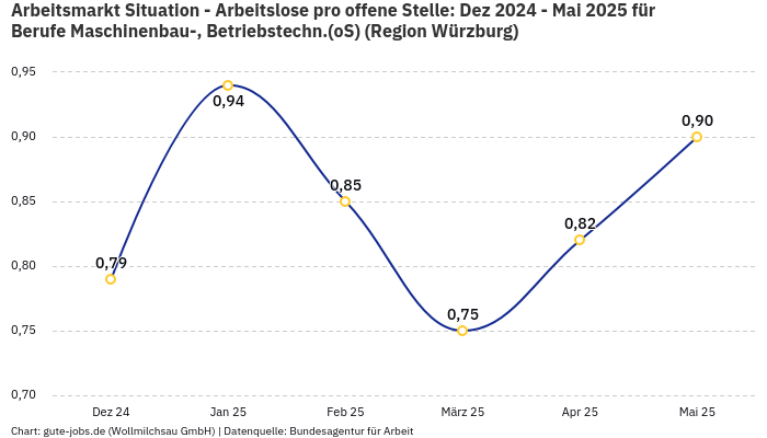 In der Arbeitsmarktregion Würzburg, in der Du Deine Jobsuchte tätigst, besteht ein hoher Bedarf an Fachkräften, weshalb hier von einem „Arbeitnehmermarkt“ gesprochen wird. Der Faktor von offenen Stellenangeboten zu Arbeitslosen liegt bei 0,94. Dieser ist damit kleiner als der Faktor für das Bundesland Bayern von 0,98.