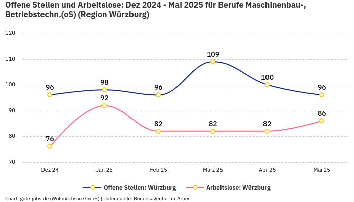 Im Bundesland Bayern verzeichnet die Bundesagentur für Arbeit im November 2025 rund 92.037 beschäftigte und 2.265 arbeitslose Personen, in der Berufsuntergruppe “Berufe Maschinenbau-, Betriebstechn.(oS)”. Die “berufsspezifische” Beschäftigungsquote (Beschäftigte / (Arbeitslose+Beschäftigte)) beläuft sich damit auf 97,60%.