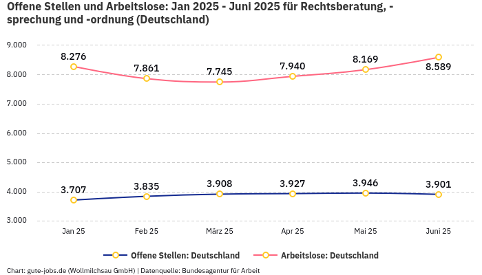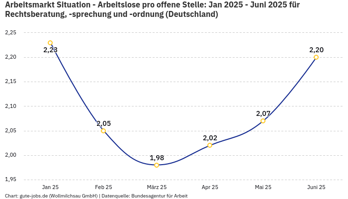 Der gesuchte Job als Jurist gehört nach der offiziellen Statistik der Bundesagentur für Arbeit zu der Berufsuntergruppe “Rechtsberatung, -sprechung und -ordnung”. Da für deine Suche keine Ortsangabe vorliegt, schätzen wir die Situation für ganz Deutschland ein. Mit aktuell 3.612 bundesweit gemeldeten unbesetzten Stellen und 8.370 gemeldeten Arbeitslosen ergibt sich ein Verhältnis von 2,32 Arbeitslosen auf eine offene Stelle. Was bedeutet das genau?