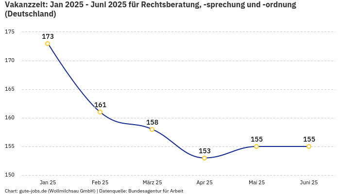 Wie lange es dauert, den passenden Job zu finden, ist natürlich von viele Faktoren abhängig, auf die wir keinerlei Einfluss nehmen können. Viele Dinge sind abhängig von Deinem Profil und Deiner Bewerbung. Ein durchaus messbarer Faktor ist jedoch die sogenannte Vakanzzeit für die Berufsuntergruppe "Rechtsberatung, -sprechung und -ordnung". Diese Variable gibt die Dauer der Suche aus der Sicht der Arbeitgeber an. Lange Suchdauer für Arbeitgeber bedeutet kürzere Suchdauer für die Bewerber und umgekehrt.