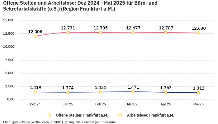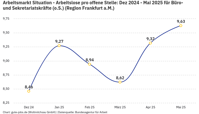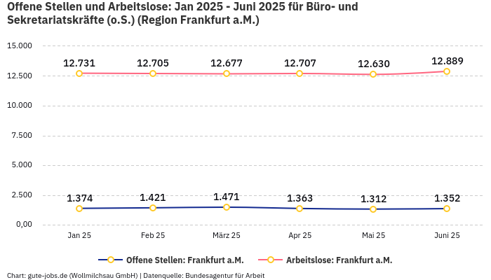 Wir verraten Dir, wie Deine Chancen auf eine erfolgreiche Bewerbung als Kaufmännischer Mitarbeiter in Frankfurt (Main) sind. Laut offiziellen Zahlen stehen in der Berufsgruppe “Büro- und Sekretariatskräfte (o.S.)” im Monat 12.621 registrierten Arbeitslosen bei der Bundesagentur für Arbeit 1.124 offene Arbeitsplätze gegenüber. So kamen in der Arbeitsmarktregion Frankfurt a.M., in der Du einen neuen Job suchst, im November 2025 11,23 Arbeitslose auf eine offene Stelle.