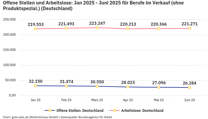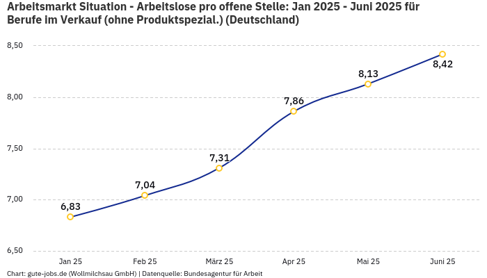 Nun zum dem Arbeitsmarktgleichgewicht. Berufe in der Kategorie “Berufe im Verkauf (ohne Produktspezial.)” haben einen Faktor von 7.56, es stehen also einer ausgeschriebenen Stelle in Deutschland insgesamt 7.56 Jobsuchende gegenüber, es sind mehr als 5. Somit bezeichnet sich der Arbeitsmarkt per Definition als Arbeitgebermarkt, was die Suche allgemein für Bewerber eher schwierig macht. Dies kann sich jedoch regional unterscheiden und ist somit kein direkter Grund zur Sorge.Berufe in der Kategorie “Berufe im Verkauf (ohne Produktspezial.)” haben einen Faktor von 7.56, es stehen also einer ausgeschrieben Stelle in Deutschland insgesamt 7.56 Jobsuchende gegenüber. Bei einem Faktor zwischen 3 und 5, was bei Deinem Beruf der Fall ist, spricht man von einem normalen Verhältnis. Insofern solltest du keine allzu großen Schwierigkeiten bei der Jobsuche haben. Da du aber in ganz Deutschland suchst, kann sich dieser Wert regional unterscheiden.