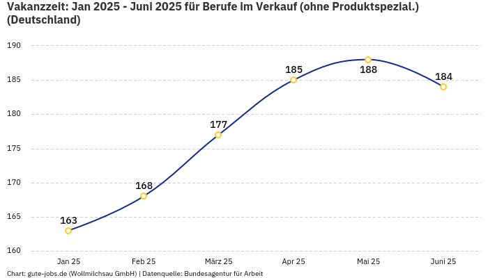 Für Kaufmann Im Einzelhandel bzw. für die Berufsuntergruppe “Berufe im Verkauf (ohne Produktspezial.)” der Bundesagentur für Arbeit wird die aktuelle Vakanzzeit für ganz Deutschland mit 147 Tagen angegeben. In den letzten 6 Monaten hat sich dieser Wert um -20,11% verkürzt. Die absolute Veränderung und den Trend kannst du im folgenden Chart nachvollziehen.