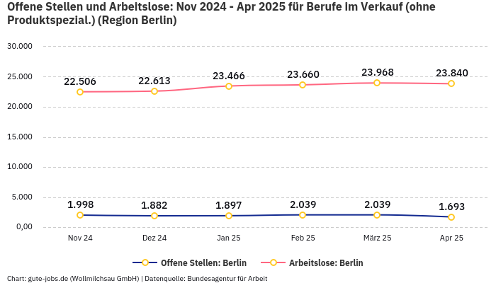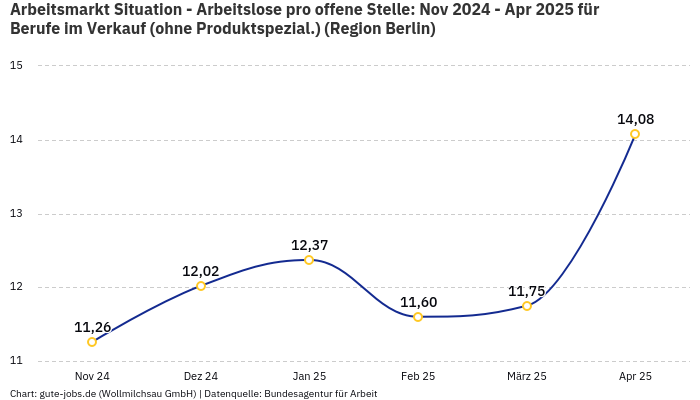In der Arbeitsmarktregion Berlin, in welcher Dein Wunschort Berlin liegt, kommen in der Berufsgruppe “Berufe im Verkauf (ohne Produktspezial.)” im Monat November statistisch gesehen 14,84 Arbeitslose auf eine offene Stelle. Diese statistische Größe ergibt sich aus 1.598 offenen Stellen und 23.708 registrierten Arbeitslosen bei der Bundesagentur für Arbeit.