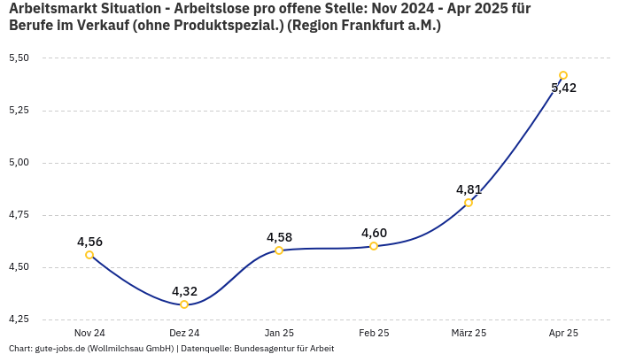 Arbeitsmarkt Situation - Arbeitslose pro offene Stelle: Juni 2025 - Nov 2025 | Für Berufe im Verkauf (ohne Produktspezial.) | Region Frankfurt a.M.