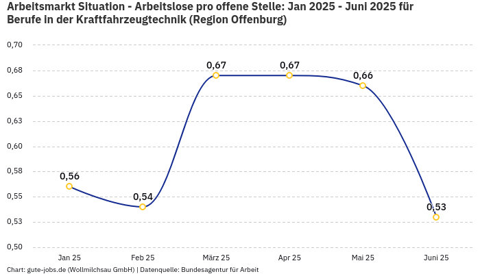 Du willst wissen, wie aussichtsreich Deine Suche als KFZ Mechatroniker in Offenburg ist? Laut Statistik „konkurrieren“ in der Berufsgruppe “Berufe in der Kraftfahrzeugtechnik” im Monat 35 registrierte Arbeitslose bei der Bundesagentur für Arbeit um 61 offene Arbeitsplätze. So kommen in der Arbeitsmarktregion Offenburg im Monat November 0,57 Arbeitslose auf eine offene Stelle.