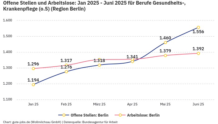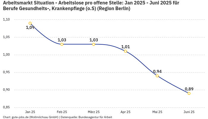 In der Arbeitsmarktregion Berlin, in welcher der Ort Berlin liegt, in dem Du Deinem Wunschberuf nachgehen möchtest, verzeichnet die Statistik in der Berufsgruppe „Berufe Gesundheits-, Krankenpflege (o.S)” im Monat November 0,89 Arbeitslose auf eine offene Stelle. Diese statistische Größe berechnet sich aus 1.561 offenen Stellen und 1.382 registrierten Arbeitslosen bei der Bundesagentur für Arbeit.