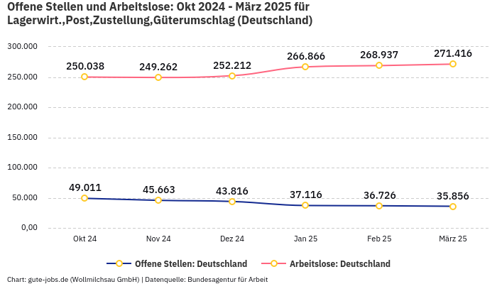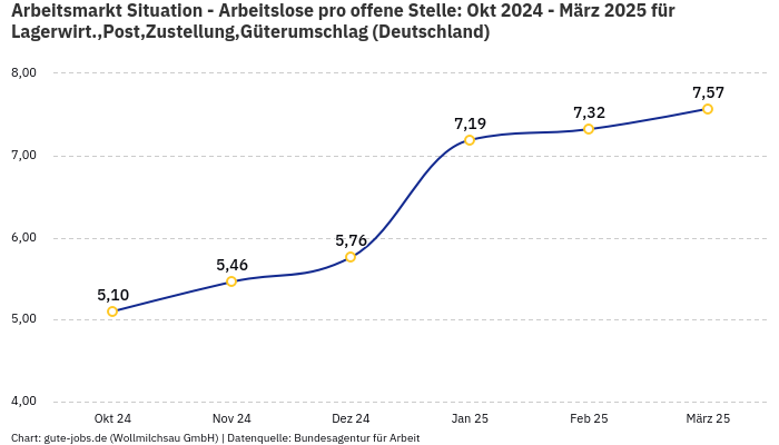 Aktuell gibt es für die Berufsunterkategorie "Lagerwirt.,Post,Zustellung,Güterumschlag", zu welcher auch der Beruf Lagerist zählt, in ganz Deutschland im November 41.713 ausgeschriebene Stellen. Zeitgleich sind 256.224 qualifizierte Personen aktuell auf Jobsuche. Es ergibt sich somit ein Verhältnis von 6,14 Jobsuchenden pro offene Stelle.