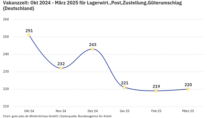 Für Lagerist bzw. für die Berufsuntergruppe “Lagerwirt.,Post,Zustellung,Güterumschlag” der Bundesagentur für Arbeit wird die aktuelle Vakanzzeit für ganz Deutschland mit 167 Tagen angegeben. In den letzten 6 Monaten hat sich dieser Wert um -17,33% verkürzt. Die absolute Veränderung und den Trend kannst du im folgenden Chart nachvollziehen.