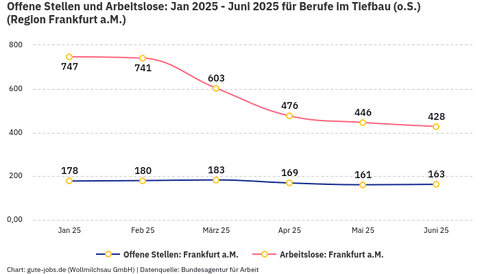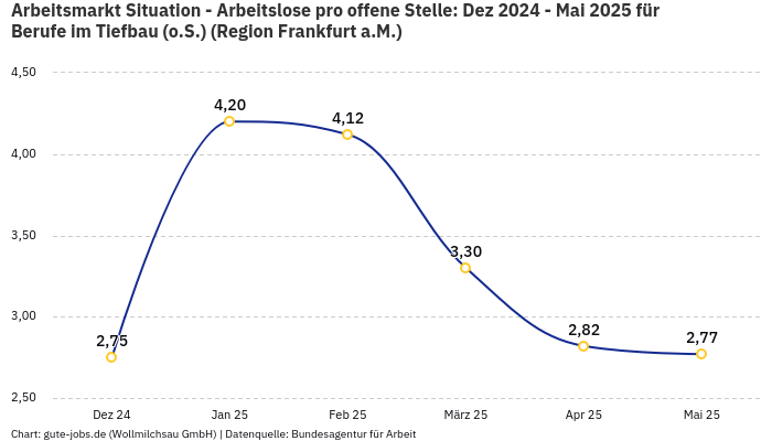 Für den Beruf Meister Tiefbau gibt es in unserer Jobbörse aktuell 15 offene Stellen. Die durchschnittliche Vakanzzeit, also der Zeitraum von der Veröffentlichung der Stellenanzeige bis zur endgültigen Einstellung, beträgt für die Arbeitsmarktregion Frankfurt a.M. 227 Tage.