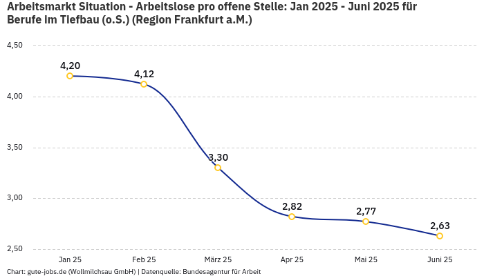 Du suchst eine Stelle als Meister Tiefbau in Frankfurt (Main) und willst wissen, wie Deine Chancen auf eine erfolgreiche Bewerbung stehen? Dann bieten wir Dir hier exklusive Einblicke in den regionalen Arbeitsmarkt. Die Arbeitsmarktlage kann von Region zu Region unterschiedlich ausfallen. Wirtschaftlich gut aufgestellte Regionen zeichnen sich durch eine geringe Arbeitslosigkeit und einen Fachkräfte-Engpass aus, während wirtschaftlich weniger prosperierende Regionen durch hohe Arbeitslosigkeit charakterisiert sind.