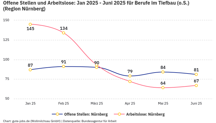 In der Arbeitsmarktregion Nürnberg, in welcher der Ort Nürnberg liegt, in dem Du Deinem Wunschberuf nachgehen möchtest, verzeichnet die Statistik in der Berufsgruppe „Berufe im Tiefbau (o.S.)” im Monat November 0,79 Arbeitslose auf eine offene Stelle. Diese statistische Größe berechnet sich aus 72 offenen Stellen und 57 registrierten Arbeitslosen bei der Bundesagentur für Arbeit.