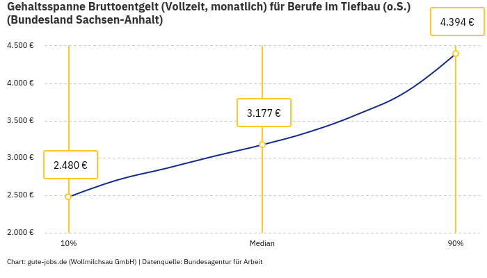 In ganz Deutschland liegt das Durchschnittsgehalt für Meister Tiefbau und verwandte Berufe bei 3.602 Euro, also über dem Gehalt in Sachsen-Anhalt.