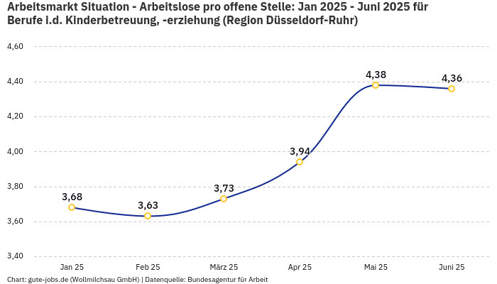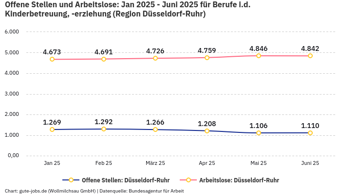 Wir verraten Dir, wie Deine Chancen auf eine erfolgreiche Bewerbung als Pädagogische Fachkraft in Düsseldorf sind. Laut offiziellen Zahlen stehen in der Berufsgruppe “Berufe i.d. Kinderbetreuung, -erziehung” im Monat 4.868 registrierten Arbeitslosen bei der Bundesagentur für Arbeit 1.136 offene Jobs gegenüber. So kamen in der Arbeitsmarktregion Düsseldorf-Ruhr, in der Du einen neuen Job suchst, im November 2025 4,29 Arbeitslose auf eine offene Stelle.