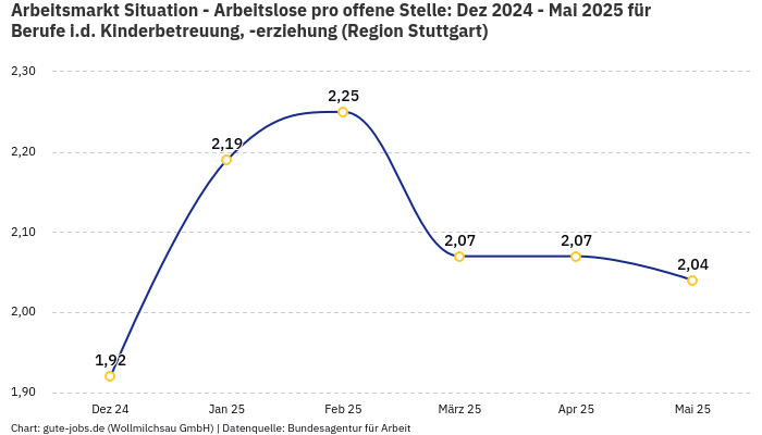 Wir verraten Dir, wie Deine Chancen auf eine erfolgreiche Bewerbung als Pädagogische Fachkraft in Heidenheim (Brenz) sind. Laut offiziellen Zahlen stehen in der Berufsgruppe “Berufe i.d. Kinderbetreuung, -erziehung” im Monat 2.013 registrierten Arbeitslosen bei der Bundesagentur für Arbeit 653 offene Stellen gegenüber. So kamen in der Arbeitsmarktregion Stuttgart, in der Du einen neuen Job suchst, im November 2025 3,08 Arbeitslose auf eine offene Stelle.