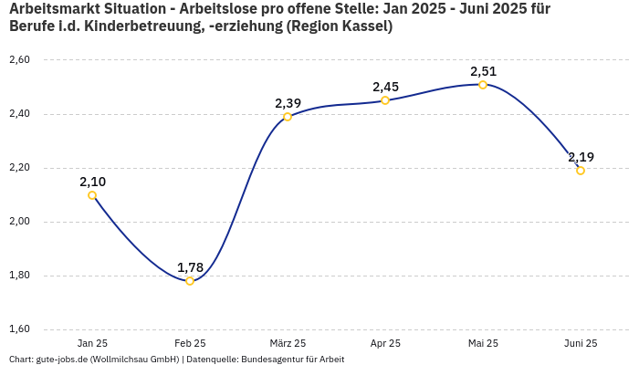 Wie sich ein Arbeitsmarkt in der Zukunft entwickelt, ist schwer vorherzusagen, da viele Faktoren Einfluss nehmen. In der Region von Kassel hat sich das Verhältnis von offenen Stellen und gemeldeten Arbeitslosen in den vergangenen sechs Monaten um 19,18% verändert. Das bedeutet, dass sich die Situation für Deine Jobsuche in letzter Zeit insgesamt deutlich verschlechtert hat. Vor 6 Monaten standen die Chancen noch deutlich besser für eine Anstellung.