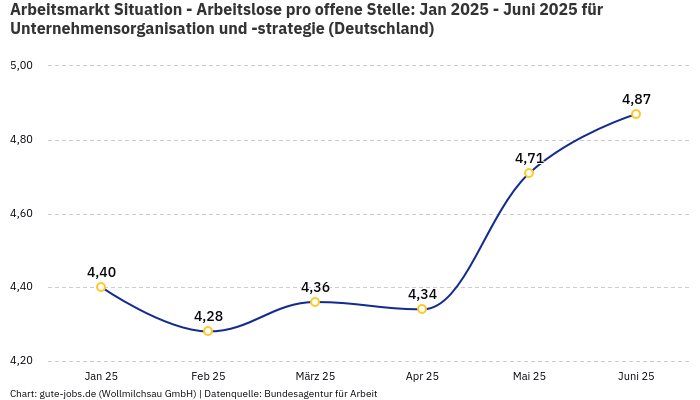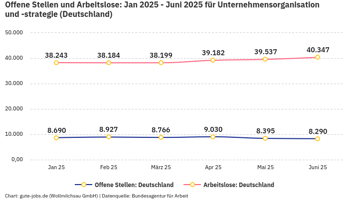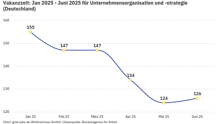 Die “Vakanzzeit” ist die Zeit in Tagen, die Firmen im Durchschnitt benötigen, um eine Position zu besetzen. Für die Berufsuntergruppe Unternehmensorganisation und -strategie wird sie für ganz Deutschland aktuell mit 127 Tagen angegeben. Diese Zahl kann auch als Ansatz zur Orientierung für Jobsuchende dienen.