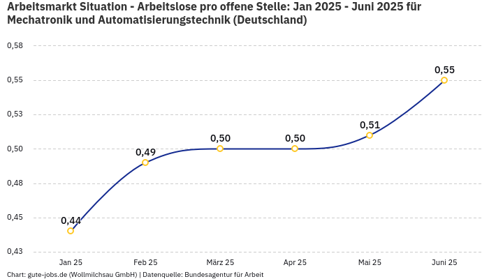 Ohne Ortsangabe stellen wir dein Gesuch als Projektleiter Automatisierungstechnik in der Berufsgruppe “Mechatronik und Automatisierungstechnik” mit aktuell 7.793 offenen Stellenausschreibungen, den 4.274 offiziell gemeldeten Arbeitslosen gegenüber. Daraus ergibt sich folgendes Verhältnis: 0,55 Arbeitslose je offener Stelle. Dieser Faktor – je kleiner, desto besser - ist äußerst relevant für Dich!