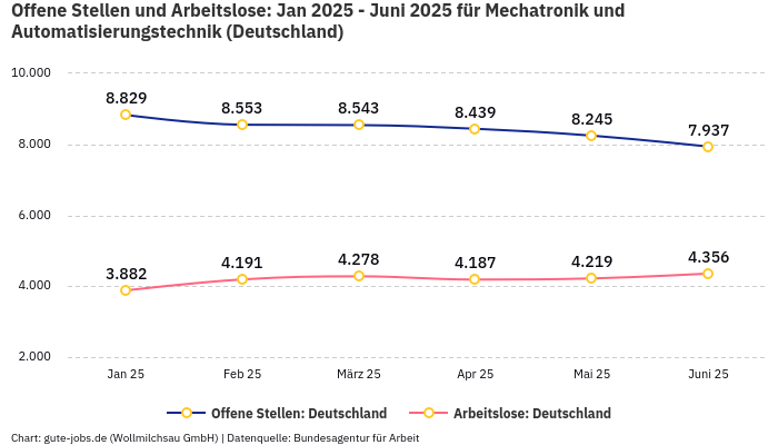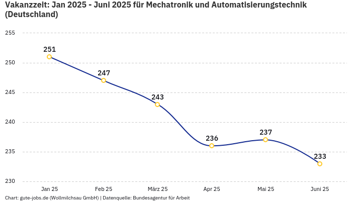 Wie lange es dauert, den passenden Job zu finden, ist natürlich von viele Faktoren abhängig, auf die wir keinerlei Einfluss nehmen können. Viele Dinge sind abhängig von Deinem Profil und Deiner Bewerbung. Ein durchaus messbarer Faktor ist jedoch die sogenannte Vakanzzeit für die Berufsuntergruppe "Mechatronik und Automatisierungstechnik". Diese Variable gibt die Dauer der Suche aus der Sicht der Arbeitgeber an. Lange Suchdauer für Arbeitgeber bedeutet kürzere Suchdauer für die Bewerber und umgekehrt.