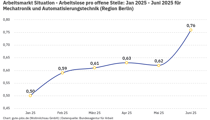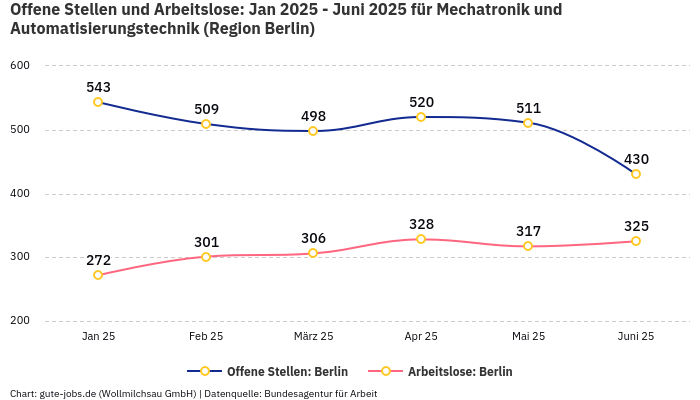 Im Bundesland Berlin verzeichnet die Bundesagentur für Arbeit im November 2025 rund 1.891 beschäftigte und 225 arbeitslose Personen, in der Berufsuntergruppe “Mechatronik und Automatisierungstechnik”. Die “berufsspezifische” Beschäftigungsquote (Beschäftigte / (Arbeitslose+Beschäftigte)) beläuft sich damit auf 89,37%.