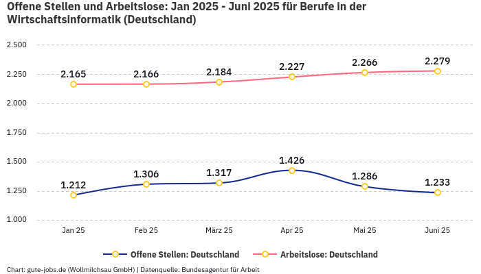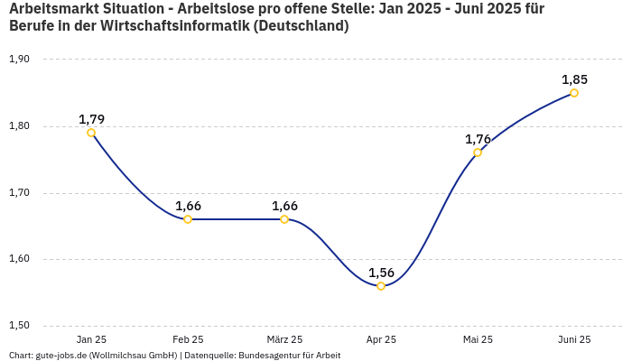 Das Fachkräfteangebotsverhältnis liegt gerade bei unter 3. Damit qualifizieren sich die Berufe, die zu “Berufe in der Wirtschaftsinformatik” zählen, als Engpassberufe. Arbeitgeber mögen keine Engpassberufe, da sie große Schwierigkeiten haben, solche Stellen zu besetzen. Für dich als Bewerber ist das gar nicht schlecht. Und auch für deine Gahaltsverhandlungen kann es vorteilhaft sein, zu wissen, wie stark dein Beruf gerade nachgefragt ist. Ebenfalls interessant ist der Trend der vergangenen Monate. Die Dynamik des Marktes ermöglicht eine noch bessere Perspektive.