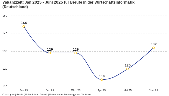 Die Vakanzzeit für deine gesuchte Berufsgruppe “Berufe in der Wirtschaftsinformatik” beträgt deutschlandweit 122 Tage.