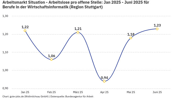 In der Arbeitsmarktregion Stuttgart, in welcher Dein Wunschort Stuttgart liegt, kommen in der Berufsgruppe “Berufe in der Wirtschaftsinformatik” im Monat November statistisch gesehen 2,85 Arbeitslose auf eine offene Stelle. Diese statistische Größe ergibt sich aus 65 offenen Stellen und 185 registrierten Arbeitslosen bei der Bundesagentur für Arbeit.