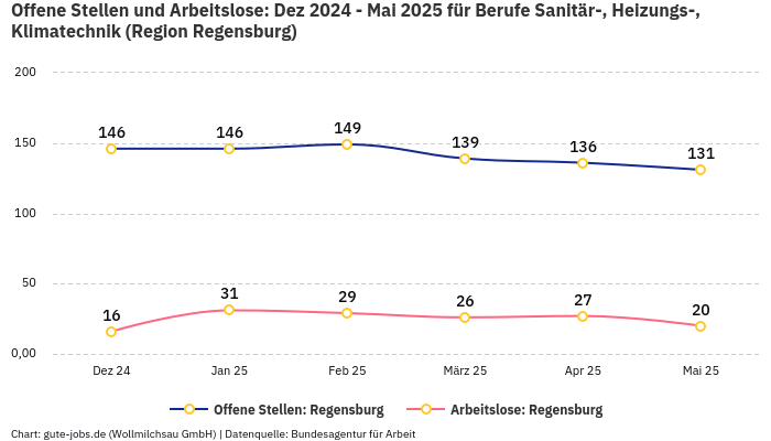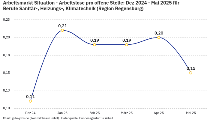 Im Bundesland Bayern verzeichnet die Bundesagentur für Arbeit im November 2025 rund 25.277 beschäftigte und 413 arbeitslose Personen, in der Berufsuntergruppe “Berufe Sanitär-, Heizungs-, Klimatechnik”. Die “berufsspezifische” Beschäftigungsquote (Beschäftigte / (Arbeitslose+Beschäftigte)) beläuft sich damit auf 98,39%.