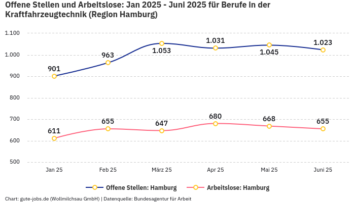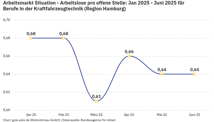 Wir verraten Dir, wie Deine Chancen auf eine erfolgreiche Bewerbung als Techniker Fahrzeuginstandhaltung in Hamburg sind. Laut offiziellen Zahlen stehen in der Berufsgruppe “Berufe in der Kraftfahrzeugtechnik” im Monat 627 registrierten Arbeitslosen bei der Bundesagentur für Arbeit 966 offene Stellen gegenüber. So kamen in der Arbeitsmarktregion Hamburg, in der Du einen neuen Job suchst, im November 2025 0,65 Arbeitslose auf eine offene Stelle.