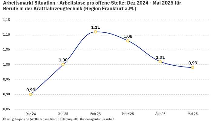 Momentan haben wir in unserer Stellenbörse 1 offene Jobs zu bieten. Um eine Stelle in dem von Dir gewünschten Beruf zu besetzen, vergehen in der Arbeitsmarktregion Frankfurt a.M. im Schnitt234 Tage.