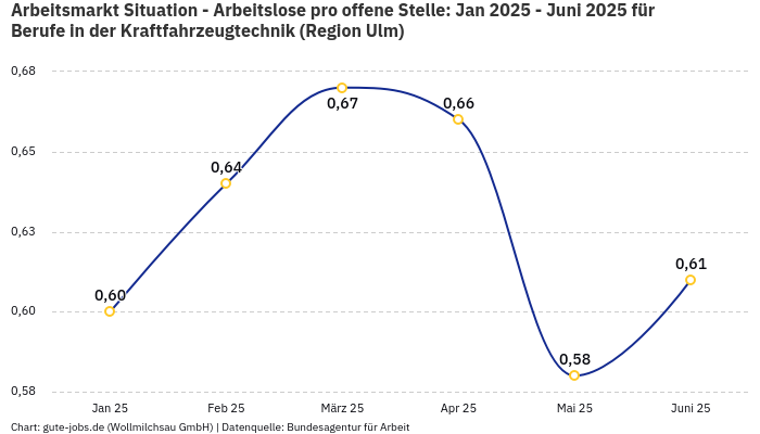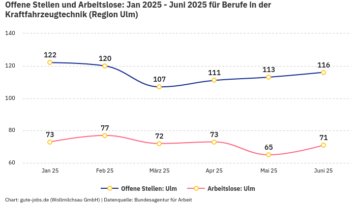 Wie genau sich die Situation in den letzten 6 Monaten auf dem Arbeitsmarkt Ulm entwickelt haben, kannst Du aus folgender Grafik anhand von absoluten Zahlen der offenen Stellen und gemeldeten Arbeitslosen ablesen.