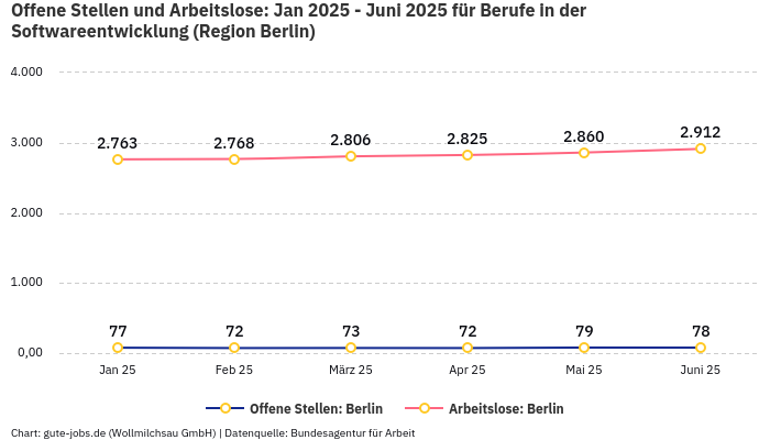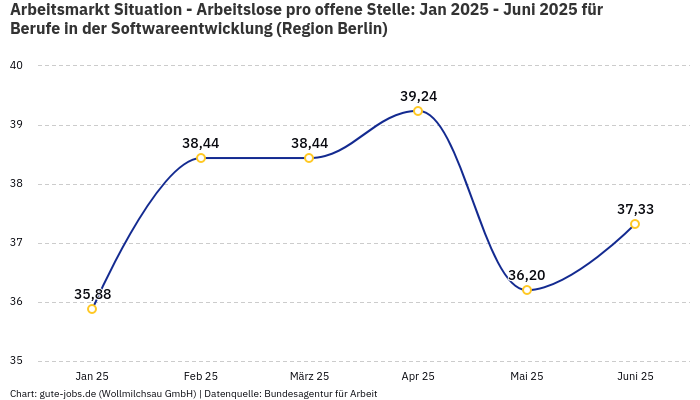 Du willst wissen, wie aussichtsreich Deine Suche als Web Developer in Berlin ist? Laut Statistik „konkurrieren“ in der Berufsgruppe “Berufe in der Softwareentwicklung” im Monat 3.086 registrierte Arbeitslose bei der Bundesagentur für Arbeit um 96 offene Jobs. So kommen in der Arbeitsmarktregion Berlin im Monat November 32,15 Arbeitslose auf eine offene Stelle.